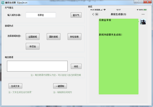 晨报生成器绿色版是一款非常实用的晨报生成软件,晨报生成器绿色版非常适合政府单位或者乡镇企业的HR使用,在群内每天发布消息使用,通过晨报生成器可以实时生成资讯、天气、每日寄语等,新闻、天气,每日寄语,实时生成最新资讯(可行业选取新闻)及当前的天气(支持城市、县、乡、镇天气查询),一键复制(直接粘贴使用),自动排版,自动导出