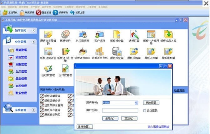快易通纸板厂ERP管理系统电脑版是款针对各个地区纸箱厂所打造的统计管理工具。快易通纸板厂ERP管理系统电脑版可以实现批量调价,自动计算单价、重量、立方、面积及纸板用料等功能,快捷有效,大大缩短你的工作时间。该工具专门为纸箱厂的各种采购、制作和出库等管理而打造,能全方面通过数据管理企业。