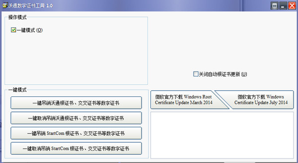 2、一键模式,可以一键吊销沃通根证书,交叉证书等数字证书等一系列一键模式操作,或者取消一键模式进行手动操作。