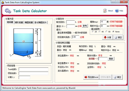 Tank data Calculator绿色版是一款功能专业实用的油罐设计计算工具,Tank data Calculator绿色版根据罐体类型,区分锥体罐、蝶形底罐、椭圆底罐等不同类型,可以满足不同设计计算需求。为多种常见Tank提资和设计提供Tank的外形数据计算。
