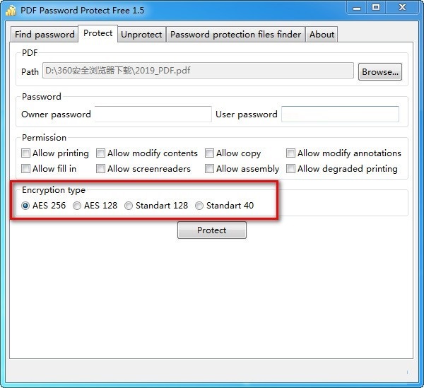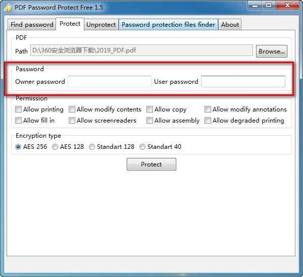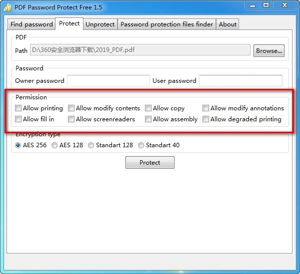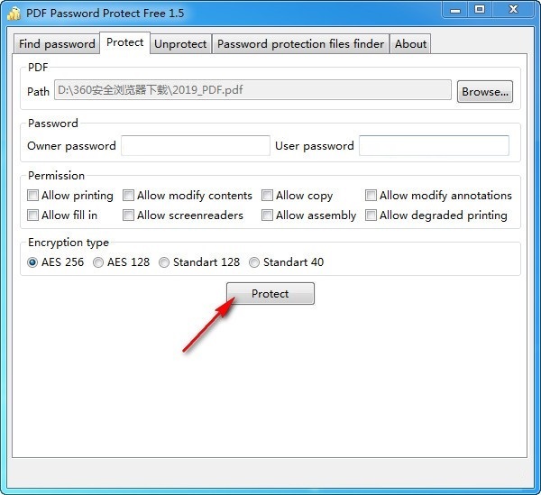pdf Password Protect Free最新版是一款不错的文件加密工具。PDF Password Protect Free官方版可以帮助用户在软件加密,将自己的PDF添加到软件就可以设置打开密码,以后打开PDF就会提示你输入密码才能访问,你也可以设置编辑密码,当编辑PDF的时候就需要输入密码,也可以禁止打印、禁止修改,可以设置的加密类型很多。