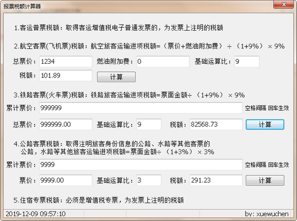 2.航空客票(飞机票)税额:航空旅客运输进项税额= (票价+燃油附加费) = (1+9%) x 9%