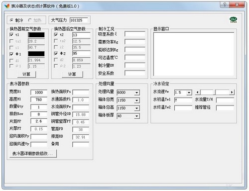 表冷器及状态点计算软件最新版是一款简单易用的计算软件,表冷器及状态点计算软件最新版可根据表冷器参数、换热器前后空气参数、处理风量等,快速计算出空气密度、蒸汽分压、空气阻力以及水阻力。