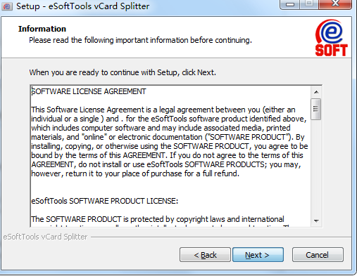 2、随即进入eSoftTools vCard Splitter的安装向导,单击【next】。