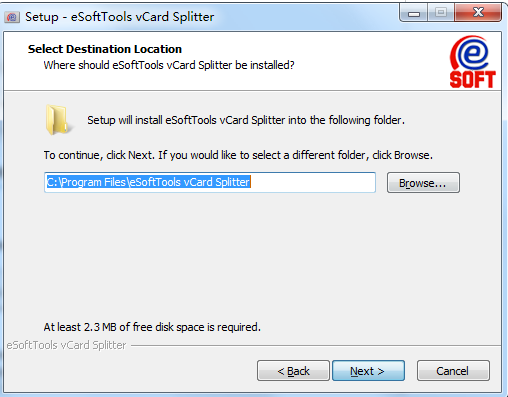 4、选择安装位置,可以选择默认的C:Program FileseSoftTools vCard Splitter。