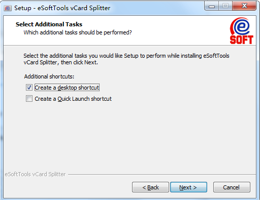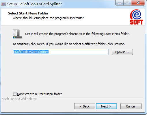 5、选择开始菜单文件夹,用户可以选择默认的eSoftTools vCard Splitter。