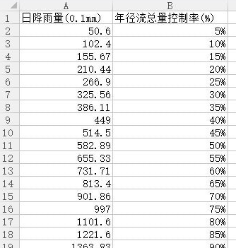 【载入数据】:正式计算的时候读取数据用的。数据可以是任意名称的文本,里面的格式是30年的日降雨量数据,日降雨量每日一行,单位为0.1mm,举例如下: