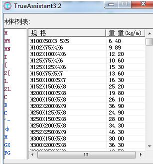 TrueAssistant预先定义了常用材料的重量,包括工字钢,H型钢,槽钢,角钢,C型钢,