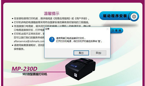 3、连接好打印机后,打开打印机电源,待打印稳定开机后,点击“是”即可