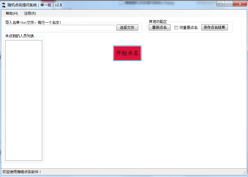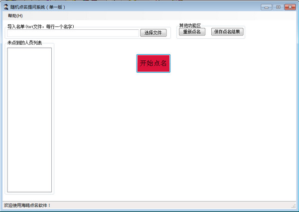 海鸥随机点名提问系统官方版是款操作简单并且非常实用的提问点名软件,校园中经常使用。海鸥随机点名提问系统官方版是Windows操作系统下的绿色、免费、简单、实用、美观的点名软件。所有功能集成在同一界面实现,易于操作和使用。而且它是一款绿色软件,无需安装,即可使用,小巧实用,不写任何注册表信息,深受用户们的喜爱。