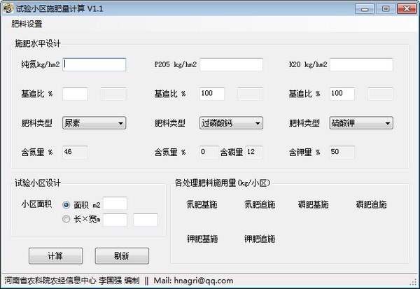 根据用户输入的纯氮、P2O5、K2O 施肥量以及氮肥的基追比,依据所用肥料类型和小区面积大小的不同,自动计算各试验小区肥料施用量。