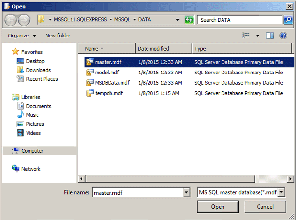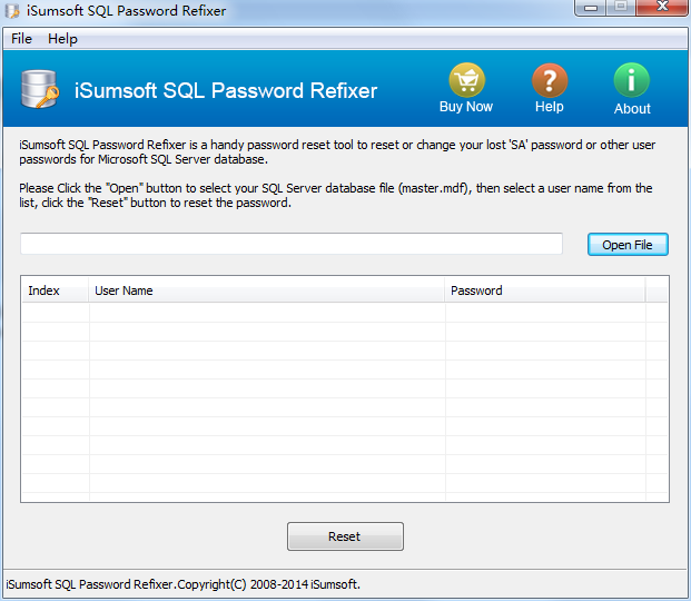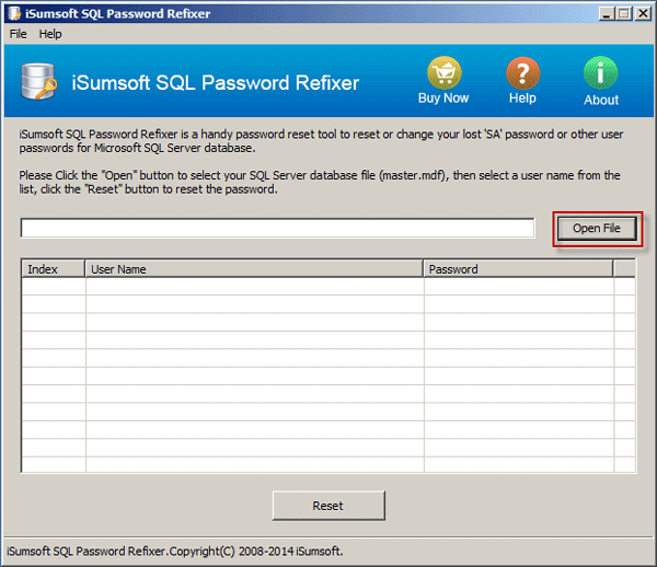 1)在计算机上安装SQL Password Refixer后,启动它,然后单击“打开文件”按钮。
