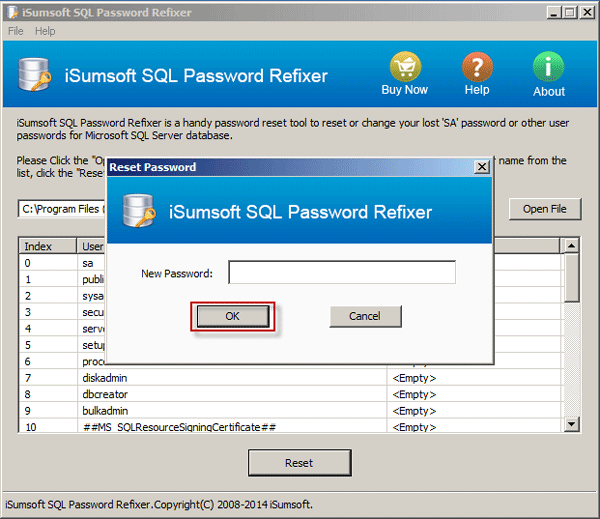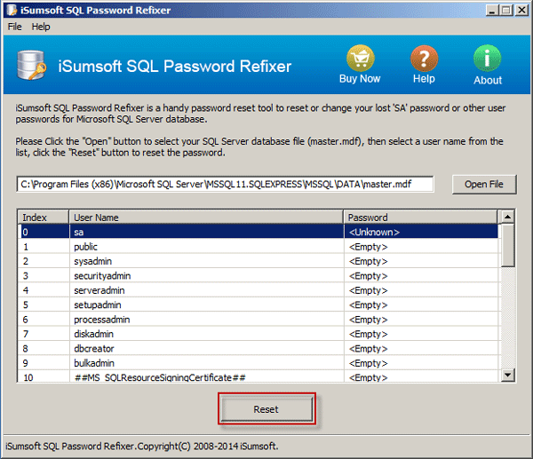 如下图所示,列出了MS SQL Server的所有用户帐户,包括SA帐户。单击要重置其密码的用户帐户,然后单击“重置”按钮。