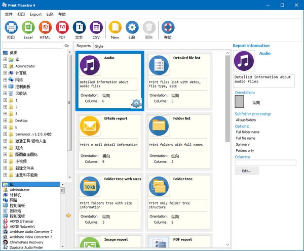 报告可以包含子文件夹,并且您可以启用打印属性,例如大小,修改日期,文件类型和图标。生成的文件可以导出为多种格式,包括HTML,PDF,Excel,富文本格式,图片,CSV,SQL,DBF和XML格式。
