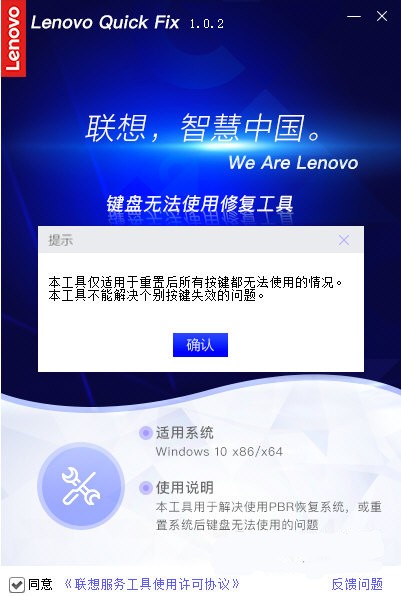 键盘无法使用修复工具官方版一款联想官方为其笔记本电脑推出的键盘修复工具,键盘无法使用修复工具官方版主要用于解决使用PBR恢复系统,或重置系统后键盘无法使用的问题。操作非常的简单,一键修复,轻松回归正常。