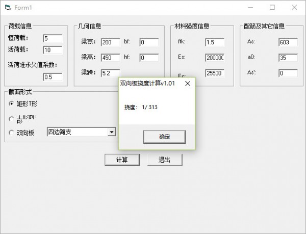 双向板挠度计算工具绿色版是一款很不错的计算器软件,双向板挠度计算工具绿色版适用于钢筋混凝土连续梁计算,只需要输入荷载信息、几何信息、材料强度信息、配筋及其他信息、截面形式等数据参数就可以进行计算了。