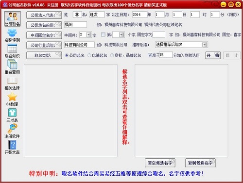 公司品牌商标起名软件官方版是一款美观易用、功能强大的公司起名软件,公司品牌商标起名软件最新版包含商标品牌起名、商标品牌测名、商标品牌注册查询等众多功能,物美价廉。按您设置轻轻一点,一下产生2000来个名字,轻松选出好听,满意的好名字,还能看公司名称评测,查重名等。