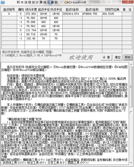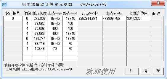 积木法自动计算线元参数官方版是款体积占据内存小且操作便捷的坐标计算软件,积木法自动计算线元参数官方版支持直线坐标计算,缓和曲线坐标计算,圆曲线坐标计算,平交路口计算工具等多种就算功能,可以帮助可以节省精力和时间完成计算。积木法自动计算线元参数是以路线的起点坐标、方位角、起终点桩号等节点元素来计算出要求的坐标。