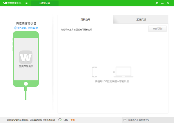 开启“完美苹果助手”后连接设备,系统会自动安装苹果驱动,安装完成后,页面左下角会自动为您显示设备信息。