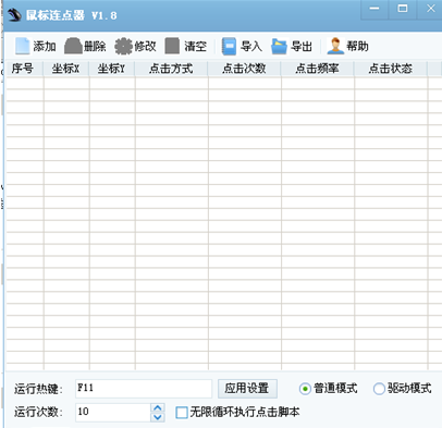 点击工具栏上的添加按钮,添加要点击的坐标(注:如果添加时不填写横坐标和纵坐标表示该次点击不移动鼠标位置)和次数。