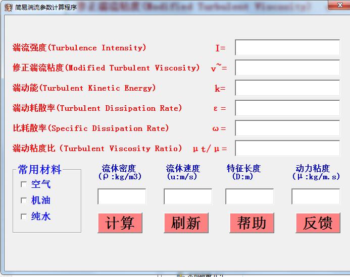 简易湍流参数计算程序正式版是一款设计相当专业且功能实用的湍流参数计算软件,简易湍流参数计算程序正式版操作十分简单,只需输入湍流强度、年度、湍动能、湍动耗散率、比耗散率和湍动粘度比,选择材料就可计算材料的流体密度、速度、长度和动力粘度值了。