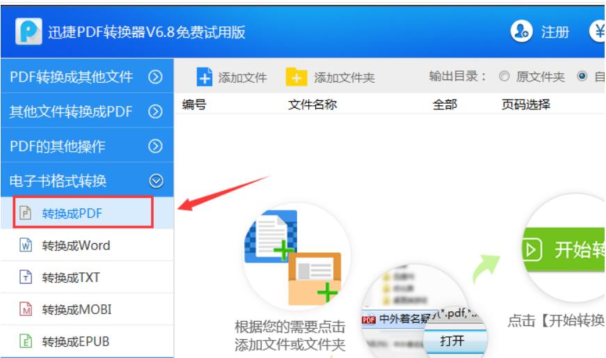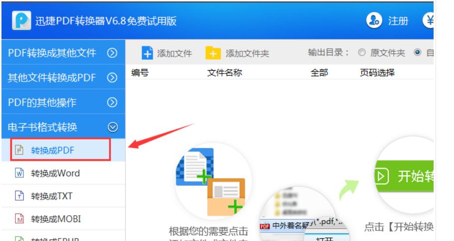 2、接下来运行这款迅捷PDF转换器,打开软件之后,需要点击软件界面左侧的“电子书格式转换”选项,然后选择里面的“转换成PDF”功能,就可以进行电子书MOBI转换成PDF文档操作了。