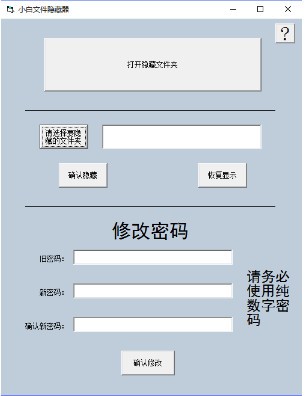 小白文件隐藏器最新版是一款简单实用的文件隐藏工具,小白文件隐藏器最新版包括4个小模块:计算器功能区,打开隐藏文件夹区,选择隐藏与恢复显示区,修改密码区。它能有效保护您的个人文件和文件夹不被他人查看、拷贝和删除,实为一款个人电脑必备的安全工具!
