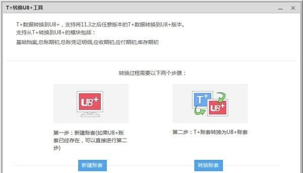 T+转换U8+工具 1.0 正式版免费过眼云烟层出不穷冰天雪地45. 黄昏的雨落得这样忧愁,那千万只柔柔的纤指抚弄着一束看不见的弦索,轻挑慢捻,触着的总是一片凄凉悲怆。100.Traffic issues not only affect our everyday life, but may also threaten people\'s lives.(2015.江苏)22.一张一弛,文武之道。 T+转换U8+工具可以将用友账套的T+数据转换到U8+,支持T+v11.3之后做任意版本数据库转到U8+版本,支持转换的模块包括基础档案,总账期初,总账凭证明细,应收期初,应付期初,库存期初。  使用方法 转换过程需要两个步骤: 第一步:新建帐套(如果U8+帐套已经存在,可以直接进行第二步骤); 第二步:T+帐套转换为U8+帐套。