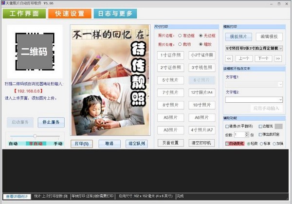 天健照片自动打印软件官方版是一款功能十分强大的照片打印工具,天健照片自动打印软件官方版拥有直观的操作界面,内置强大的功能,其软件系统自动剪切,自动排版,自动根据选定尺寸打印出照片,支持手机快速连接上传照片并交由电脑处理和打印,是一款很好用的自助打印系统