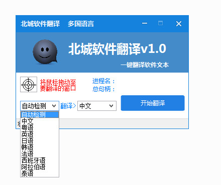 这时准星右边会显示该程序的进程名,然后选择翻译的语言点击开始翻译即可。