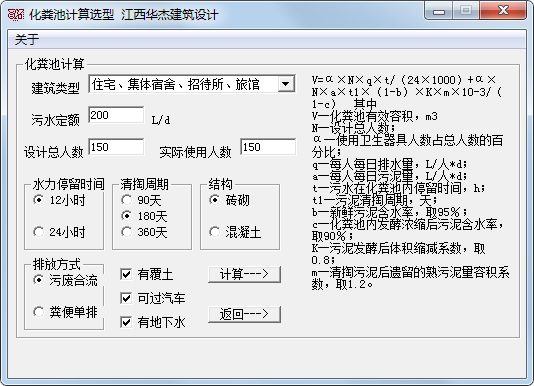 化粪池计算选型工具官方版是一款非常专业的计算软件,计算结果非常的精确。化粪池计算选型工具官方版是由江西华杰建筑研发的,且软件拥有简单化的操作界面,内置实用的功能,可以以帮助大家快速便捷的计算出化粪池大小,让用户更能准确的购买化粪池。