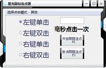 星光鼠标连点器绿色版是一款功能相当不错的鼠标连点器软件,星光鼠标连点器绿色版能够帮助用户进行鼠标连点,能够支持跟随跟随点击模式、定位点击模式、综合点击模式三种连点模式,满足用户不同的连点需求,而且其操作十分简单,用户设置连点的模式与具体的模式设置后,即可通过热键随时开启与取消,让您能够随停随用。