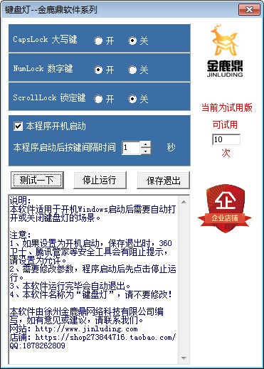 鹿鼎键盘灯绿色版是一款控制键盘开关的工具,鹿鼎键盘灯绿色版控制numlock、大小写、scrolllock的灯,不过仅仅局限于开机的时候,也就是说,你这设置的是什么样,开机时候的键盘灯就是什么样。
