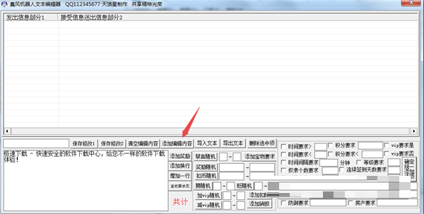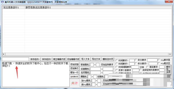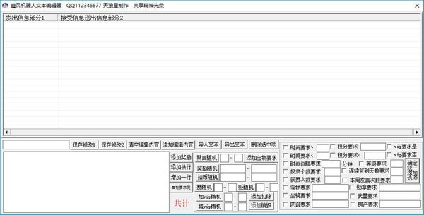 晨风机器人文本编辑器绿色版是一款系统功能强大、易上手的文本编辑器,晨风机器人文本编辑器绿色版可以自己添加代码编写程序,没有文字输入限制,可导入、导出文本,添加编辑内容,添加奖励、添加换行、随机扣币、随机奖励、随机禁言等。
