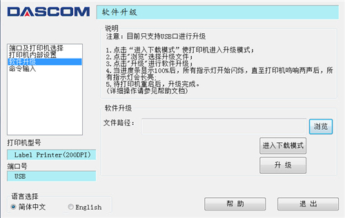 ①运行“得实微型打印机设置工具”,选择打印机型号或类型(Label Printer(200DPI))和 USB 端口。