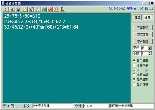 语音高级计算器官方版是一款使用相当简单、功能极为强大的计算器软件,语音高级计算器官方版带有语音播报功能,可调整背景颜色及字体大小,显示计算结果大写数字。对于计算量比较大的用户特别方便。