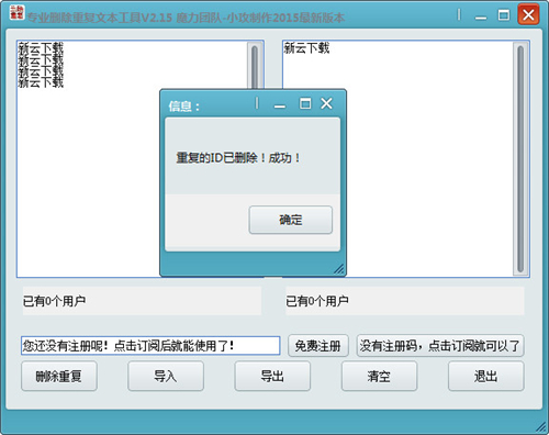 专业删除重复文本工具中文版是一款界面直观清新、非常便捷易用的文本去重软件,专业删除重复文本工具中文版可以帮助您检测并去除TXT文件中的重复文本数据的绿色软件。软件由论坛高手于2015年最新制作,重复的QQ号、邮箱号等各种大文本TXT文件都可以使用本软件来进行检测重复的数据。