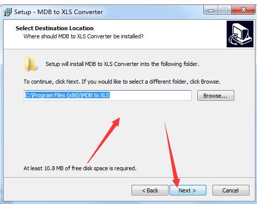 4、选择安装目的地,默认的是C:\Program Files (x86)\MDB to XLS,可以点browse修改