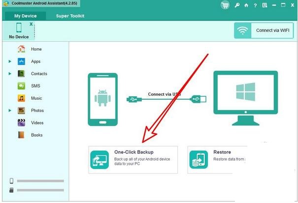 2、待软件识别出手机后,点击【one-click】就可以实现一键备份;