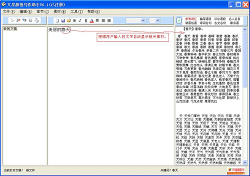 2、素材获取高效智能。为了使用户查找素材时方便快捷全面,本软件的素材数据经过复杂的前期处理和人工加工,如描写语段素材采用科学的分类体系进行详细的分类,类目达500多个,采用树状分类表清晰直观。议论素材采用关键词技术,对数据进行逐条标引,并结合汉语人工智能处理技术,使用户查找用词随意自然,但查到的数据却准确全面。集成类似WORD的文字编辑器具有素材智能显示功能,用户获得好词好句真正做到边写即边得。