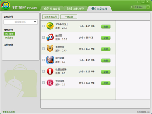 手机软件搬家工具正式版是一款界面清晰、操作简便的手机软件转移工具,手机软件搬家工具正式版使用不限手机品牌和型号,支持手机数据跨品牌,支持手机超过1000款:apple