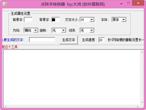 大鸿点阵字转换器正式版是一款界面简洁、适用范围广的点阵字转换软件,大鸿点阵字转换器正式版软件界面简洁,操作方便,使用后能够对生成的字进行背景和前景字以及字体大家设置,喜欢的朋友赶紧试试吧!