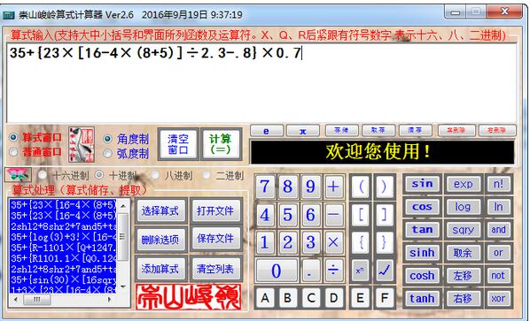 3、【函数计算】三角函数可设置度或弧度。同时提供一个简单的文件处理窗口,以方便对各算式的添加、删除、存储和提取。