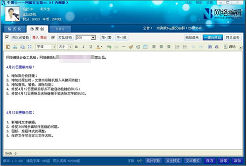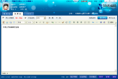 牛博士网络编辑百宝箱最新版是一款用途广泛、功能强大的网络编辑软件,可以非常快速地将复杂、紊乱、错杂的文章整理成内容规范的文章格式。牛博士网络编辑百宝箱最新版专门为网络编辑和站长开发,包含关键字查询,SEO优化,文章编辑的专业功能,是职业必备的神器。