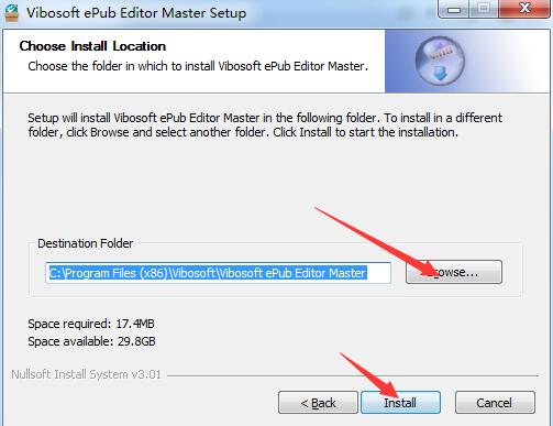 3、选择安装目的地,默认的是C:\Program Files (x86)\Vibosoft\Vibosoft ePub Editor Master,可以点browse修改,确认之后点install开始安装