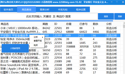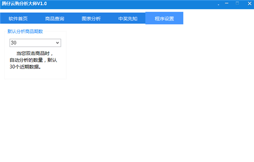 腾仔云购分析大师官方版是一款美观易用、功能强大的购物商品分析软件,腾仔云购分析大师官方版包括商品查询、中奖先知、程序设置以及图表分析多个功能模块,帮助用户自动回去云狗官方的商品购买数据情况,比昂且采用图表的方式分析商品走势,简洁直观。现在一元云购非常的火爆,不少朋友都体验过,这个软件可以对商品进行预测分析!