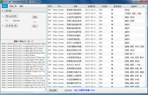 3、支持批量,这可能是最大的优点了,截至到今天,没有发现任何一款真正可用于检测广告法的软件了,在线工具倒是有那么几个,不过遗憾的是,都只能单个网页的检测,无法实现自动化,试想:如果要检测500个网页,岂不要累死?