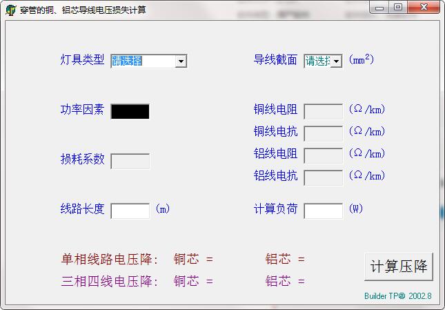 2、输入灯具类型、导线截面、功率因素、铜线电阻、损耗系数、线路长度等就可以计算出单向线路电压降和三相四线电压降