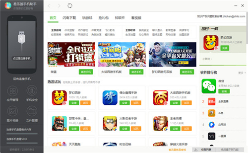 易乐游手机助手是一款强大的手机管理工具。它你可以清理你的手机垃圾信息、图片,可以管理你的通讯录,易乐游手机助手同时还提供了海量的应用资源,易乐游手机助手是盛天自主研发的手机娱乐资源分发平台,让用户管理手机,下载软件、游戏、视频、音乐等内容