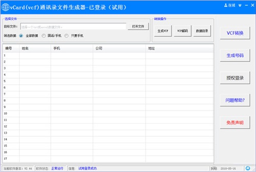 csv文件转成vCard(vcf)文件,可以将一个文件分割成多个vcf文件,可以转换到vcf文见的项目有姓名、手机、公司、地址。